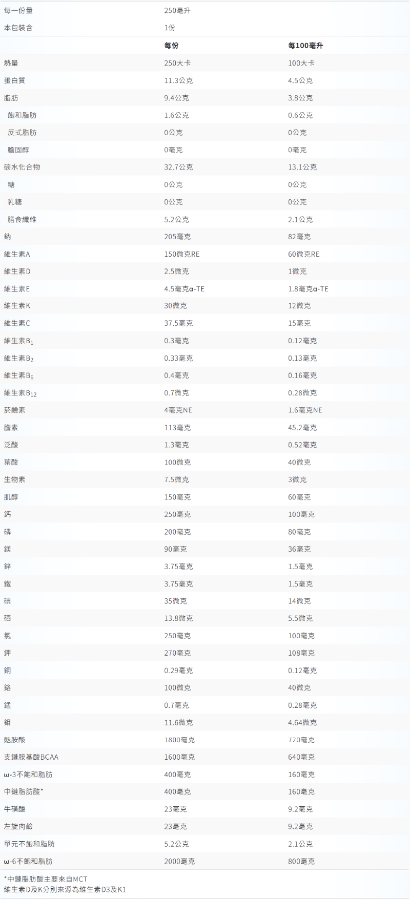 提供蛋白質18%、脂肪34%、碳水化合物48%,滲透壓300 mOsm/公斤水。每罐含有5.2公克膳食纖維。每日4~6罐可達衛福部建議國人膳食中日維生素與礦物質的建議攝取量(除氟營養素) 。