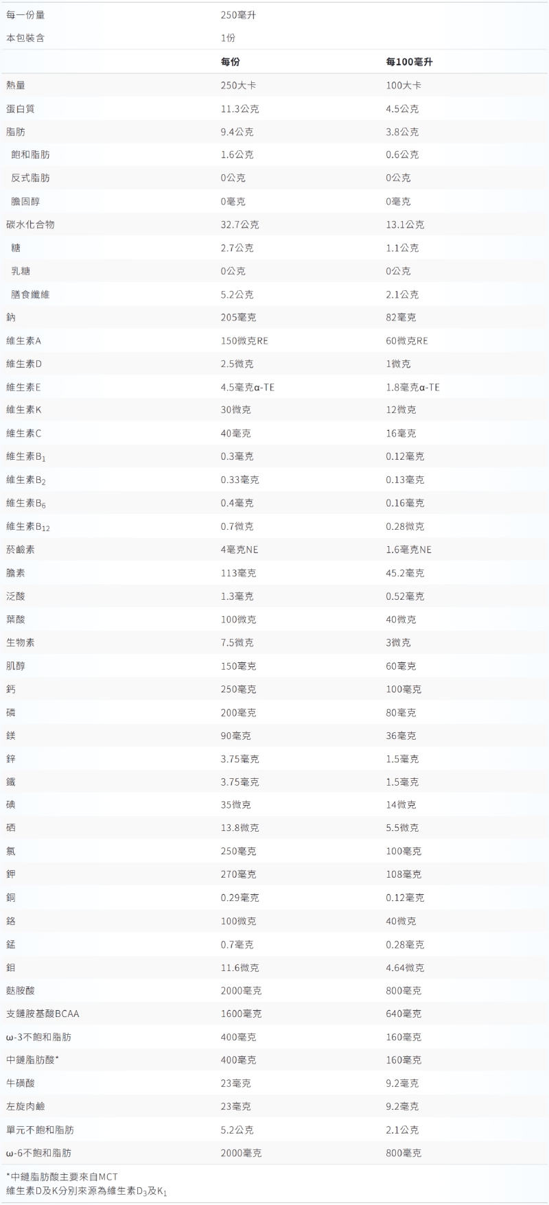 去離子水、麥芽糊精、乾酪素鈣、芥花油、難消化性麥芽糊精、葵花油、蔗糖、乾酪素鈉、菊糖、檸檬酸鉀、中鏈三酸甘油酯(MCT)、磷酸鎂、單及雙脂肪酸甘油二乙醯酒石酸酯、氯化鈉、碳酸鈣、香草香料、肌醇、氯化膽生僉、磷酸氫二鉀、牛奶香料、分離大豆蛋白、脂肪酸蔗糖酯、維生素C、濃縮乳清蛋白、結蘭膠、牛磺酸、L-肉酸、甜菊醣苷(甜味劑)、碳酸氫鈉、金盞花萃取物[大豆油、類蘿蔔素(含葉黃素]、硫酸亞鐵、羧甲基纖維素鈉、硫酸鋅、鹿角菜膠、維生素E、葡萄糖漿、辛烯基丁二酸鈉澱粉、菸鹼醯胺、綠茶萃取物(含EGCG)阿拉伯膠、硫酸錳、本多酸鈣、葡萄萃取物[環狀糊精、葡萄萃取物(含白黎蘆醇)]維生素B1、、硫酸銅、吡啶甲酸鉻、維生素B6、玉米澱粉、維生素B2、維生素A、二氧化矽、葉酸、刺梧桐膠、三氯化鉻、維生素C(抗氧化劑)、維生素E(抗氧化劑)、碘化鉀、鉬酸鈉、維生素K1、亞硒酸鈉、檸檬酸鈉、生物素、檸檬酸、維生素D3、維生素B12。本產品含有牛奶、大豆。