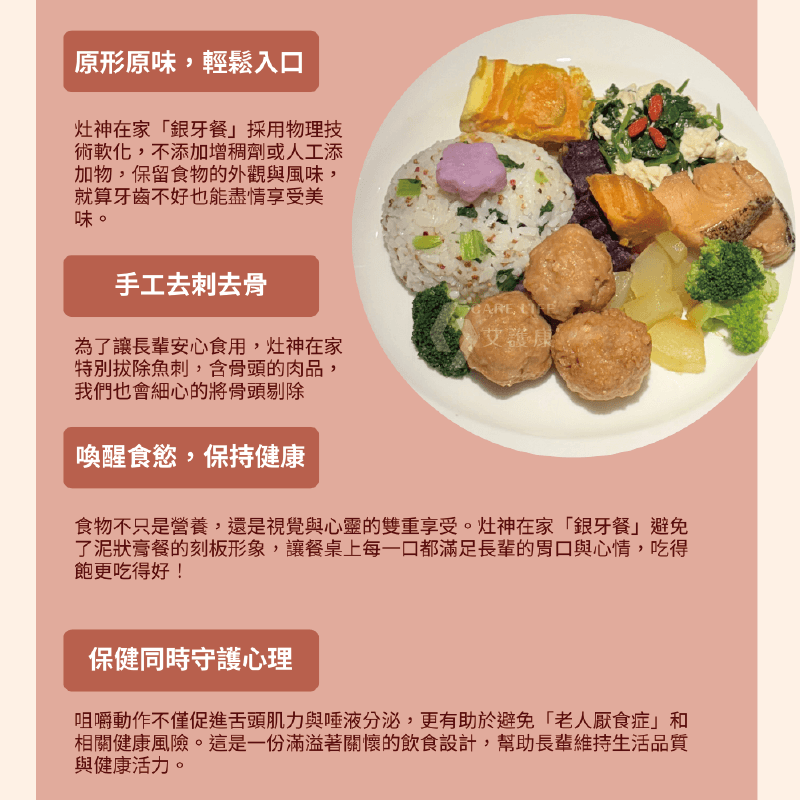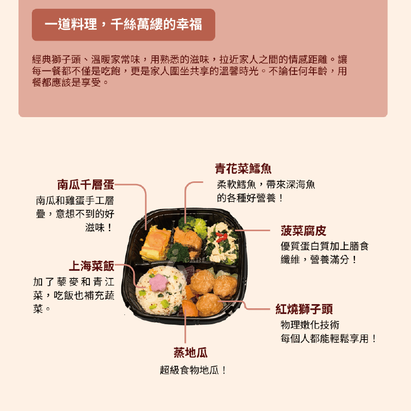 慢燉的獅子頭鮮嫩多汁,輕輕一抿就在舌尖化開,濃郁肉香與高湯的甘醇完美交融。搭配鱈魚,細緻柔滑的魚肉入口即化,帶來海洋的清甜鮮香。嚴選山藥、藜麥、枸杞、南瓜等豐富食材,細火慢煮鎖住食材原味,每一口都滿載營養與溫暖。軟嫩適口、不加增稠劑,還原最自然的家常風味,讓長輩吃得輕鬆,吃得安心,更吃得開心!