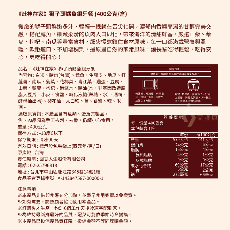 《灶神在家》獅子頭鱈魚銀牙餐 (400公克/盒)
