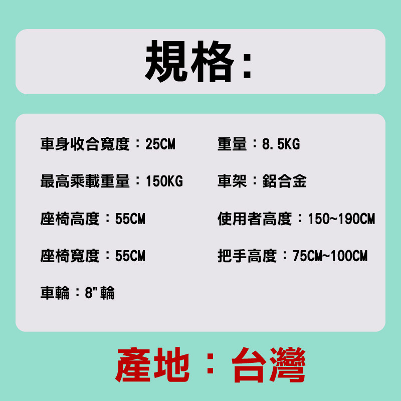 - 室內/戶外適用8" PU輪胎及輔助跨檻腳踏。