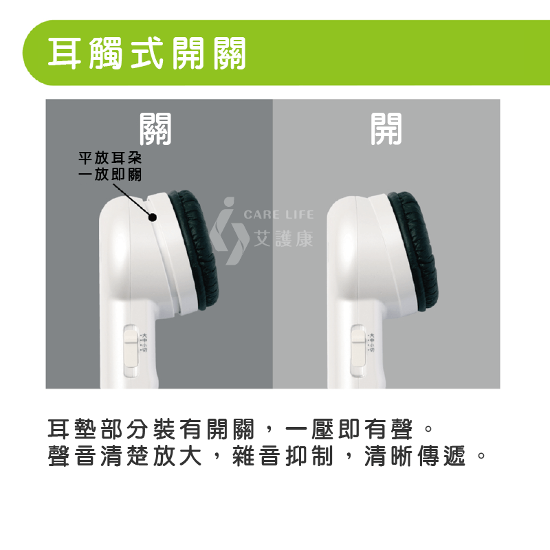 - 音量調節開關轉至「中」或「大」接近耳朵時,會發生回授現象,導致耳朵疼痛。使用時,請先將聲音調整至「小」,等碰到耳朵時,在進行音量調整。