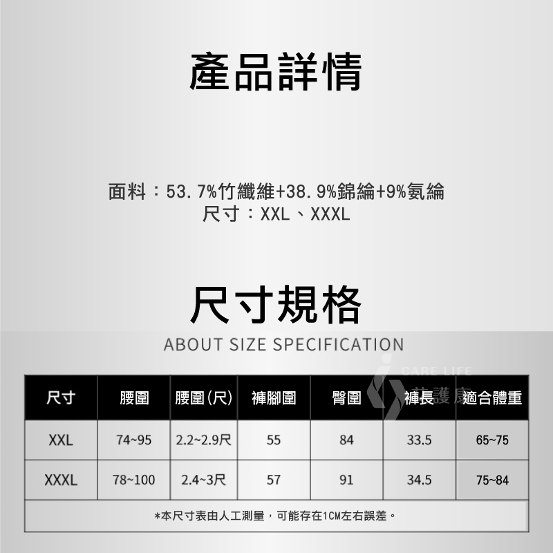 - 3XL/ 適用腰圍 31-39吋,適合體重 165-185 磅