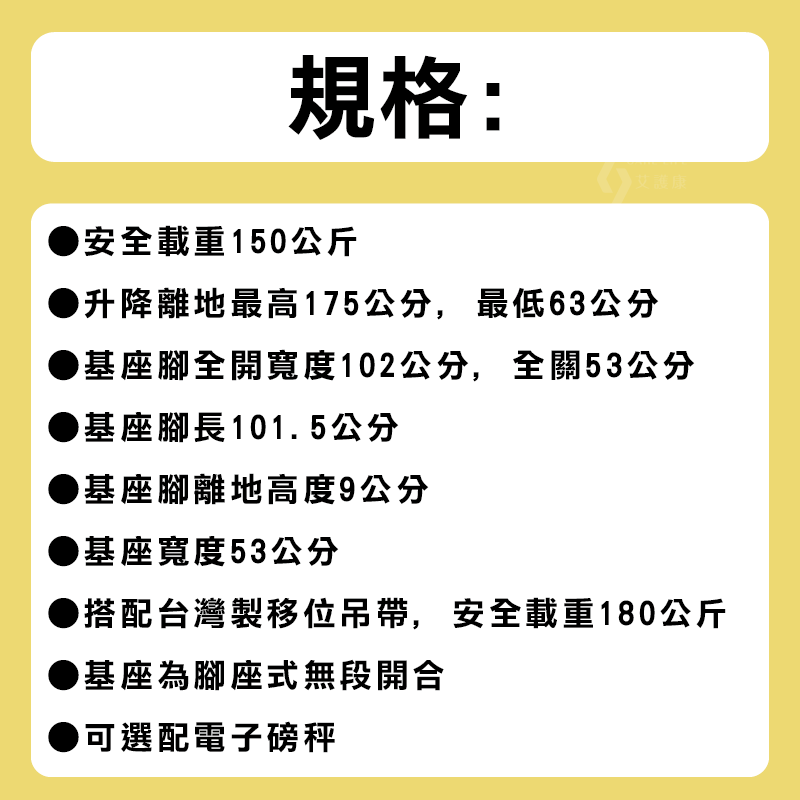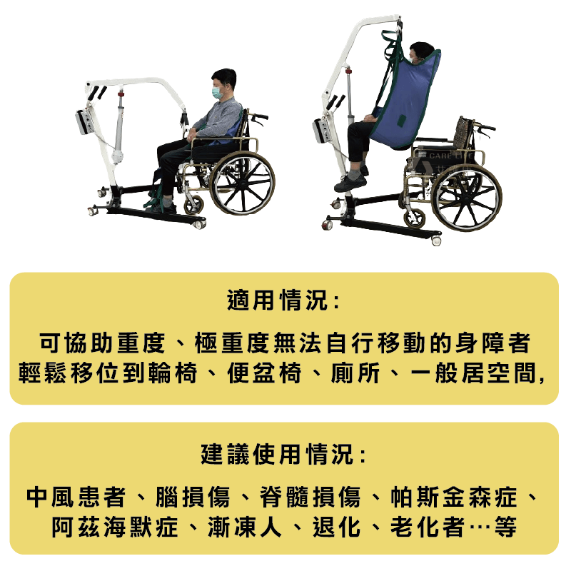 可協助重度、極重度無法自行移動的身障者輕鬆移位到輪椅、便盆椅、廁所、一般居空間,建議使用情況:中風患者、腦損傷、脊髓損傷、帕斯金森症、阿茲海默症、漸凍人、退化、老化者…等