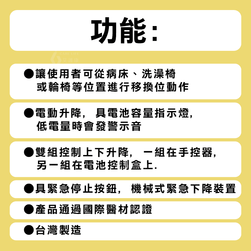 雙組控制上下升降,一組在手控器,另一組在電池控制盒上。