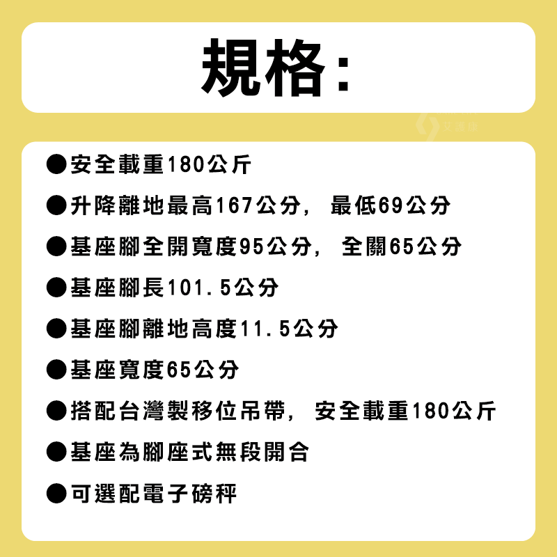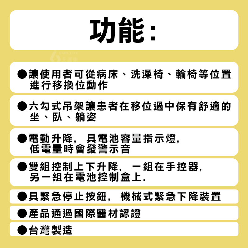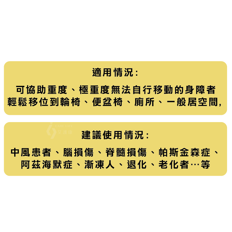 可協助重度、極重度無法自行移動的身障者輕鬆移位到輪椅、便盆椅、廁所、一般居空間, 建議使用情況:中風患者、腦損傷、脊髓損傷、帕斯金森症、阿茲海默症、漸凍人、退化、老化者…等