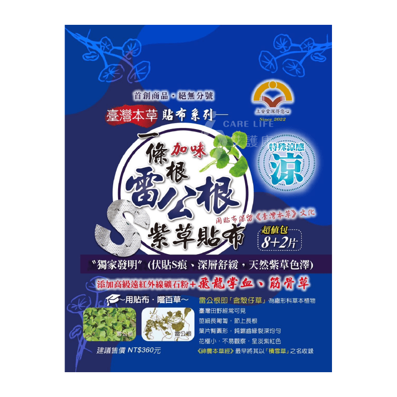 成分:雷公根(含殼仔草)、筋骨草(伸筋草)、飛龍掌血、金門一條根(闊葉大豆)、紫草、薄荷精油、冬青樹精油、薰衣草精油、貼布基劑。