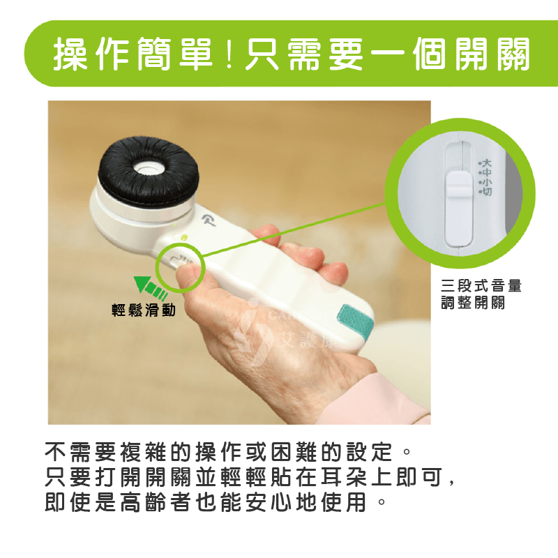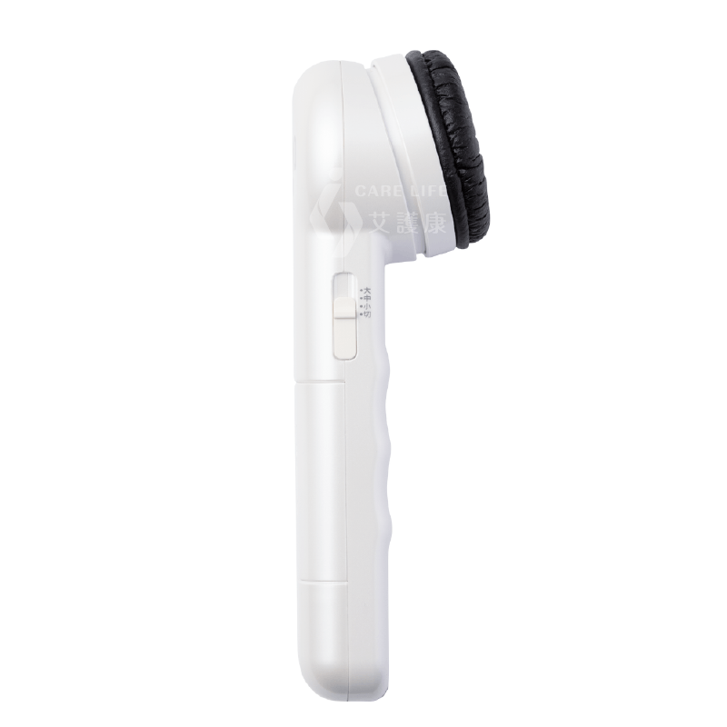 - 音量調節開關轉至「中」或「大」接近耳朵時,會發生回授現象,導致耳朵疼痛。使用時,請先將聲音調整至「小」,等碰到耳朵時,在進行音量調整。
